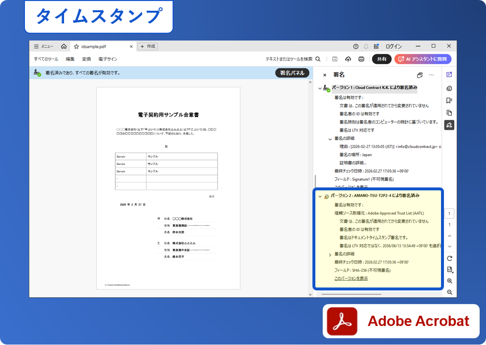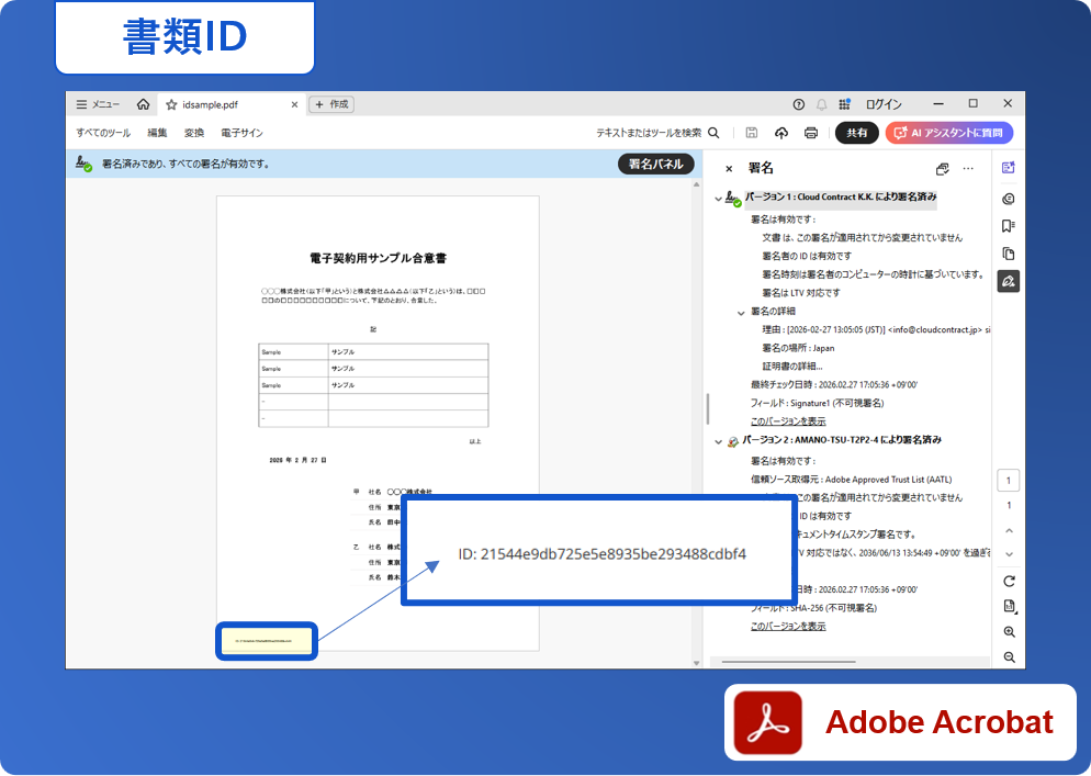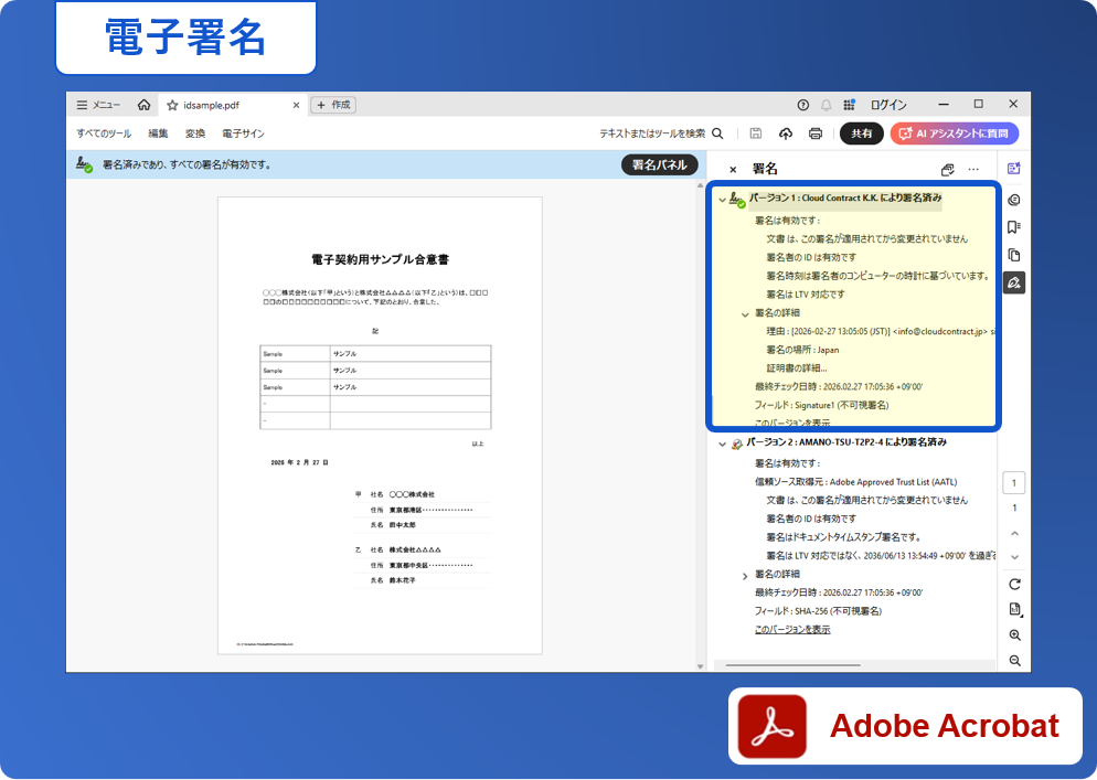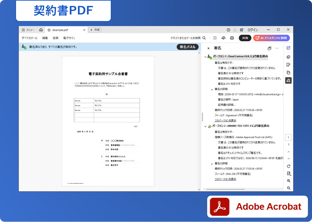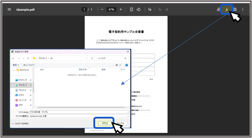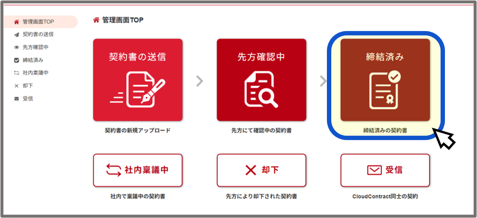 送信者は【締結済み】画面の各契約書の詳細画面から、受信者は締結後に送信されるメールのURLから契約書を表示・ダウンロードすることが可能です。