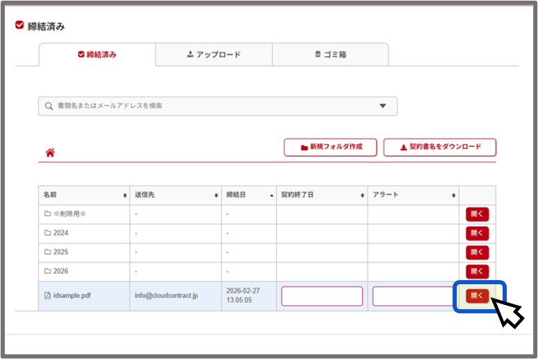 2. ダウンロードしたい契約書の【開く】ボタンを押し、詳細画面を開きます。