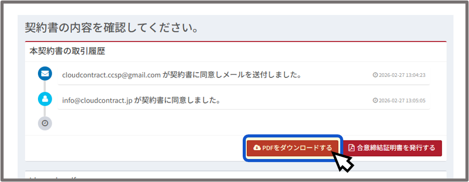 3. 合意締結した契約書の詳細画面が開きますので、【PDFをダウンロードする】を押します。
